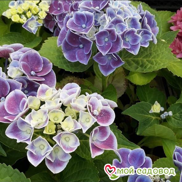 Гортензия крупнолистная Тиволи — один из самых любимых сортов. Цветет крупными соцветиями сине-фиолетового цвета с белой каймой по краю. Цветение растянуто до октября. Окрас соцветий фиолетово-синий, при слабой кислотности почвы окрас розовый, малиновый, фиолетовый, сиреневый. Куст достигает в высоту до 0,9 метров, в ширину растение занимает 1-1,2 м.   УХОД Гортензии влаголюбивы. При отсутствии дождей раз в неделю их необходимо поливать из расчета 15-20 л на куст, при наличии дождей достаточно одного полива в месяц. Чтобы повысить прочность побегов, рекомендуется полив растений слабым раствором марганцовки. Два-три раза за сезон одновременно с прополками проводят рыхление приствольных кругов. В период бутонизации удаляют все слабые веточки с соцветиями. В первые два года после посадки рекомендуется мульчирование почвы сухой листвой и окучивание куста. Место для посадки Для посадки гортензии при выращивании в южных регионах предпочтительнее выбирать полутенистое место, в средней полосе и на севере России — хорошо освещенные или слегка притененные участки. Молодые растения рекомендуется защищать от полуденного солнца и ветра. Гортензии очень влаголюбивы, поэтому посадка вблизи деревьев, поглощающих много влаги, для них не подходит.